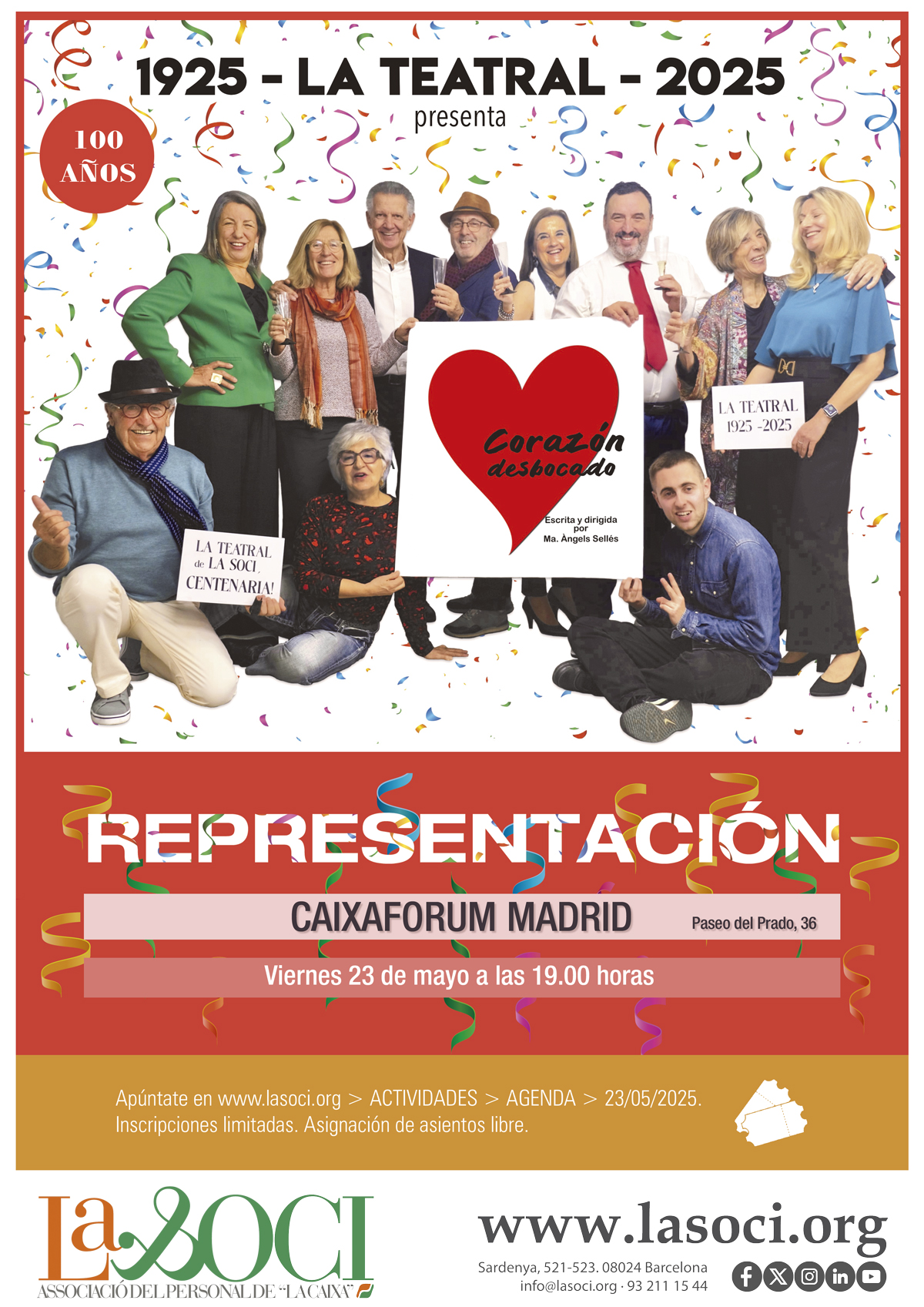 Què fem: Som la companyia de teatre de la Soci, assagem i interpretem obres per a tots els públics, el nostre teatre és inclusiu i totes les recaptacions són per a finalitats benèfiques del PAS-Voluntaris de “la Caixa”.Associat/ada: treballador/ora de CaixaBank o la Fundació Bancària “la Caixa”, que és membre de la Soci.
